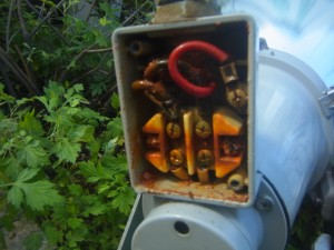↓照明器具の端子部分を開いたら水が浸入し錆びついて漏電しておりました。